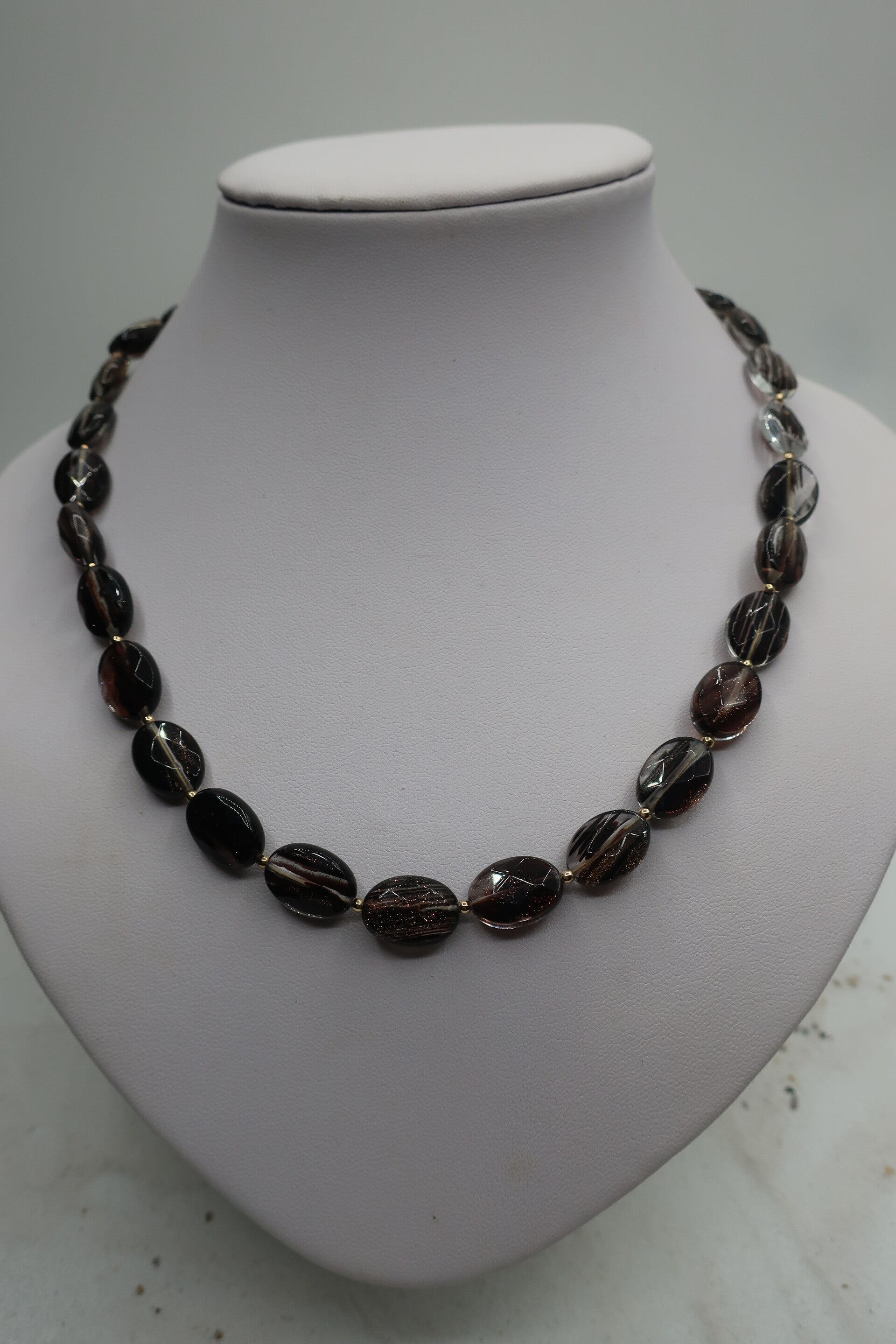 Mooi collier ontworpen met transparante bruinkleurige goudsteen. In de goudsteen zie je een goudkleurige sparkle wat mooi reflecteert in het licht.